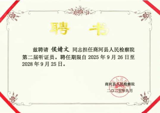 2025年9月15日,商河县人民检察院发布第二届听证员聘任公告,经资格审查、组织考察、社会公示等严格程序,我所侯婧文律师凭借扎实的法律专业功底、丰富的实务经验及良好的职业声誉,成功当选商河县人民检察院听证员,聘期三年。