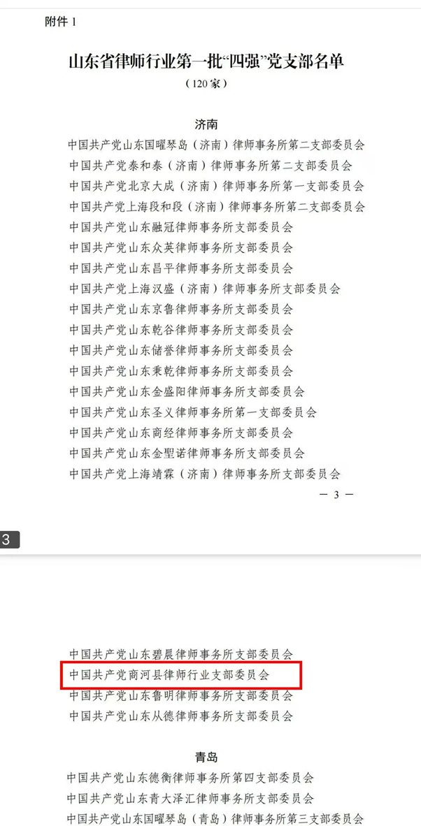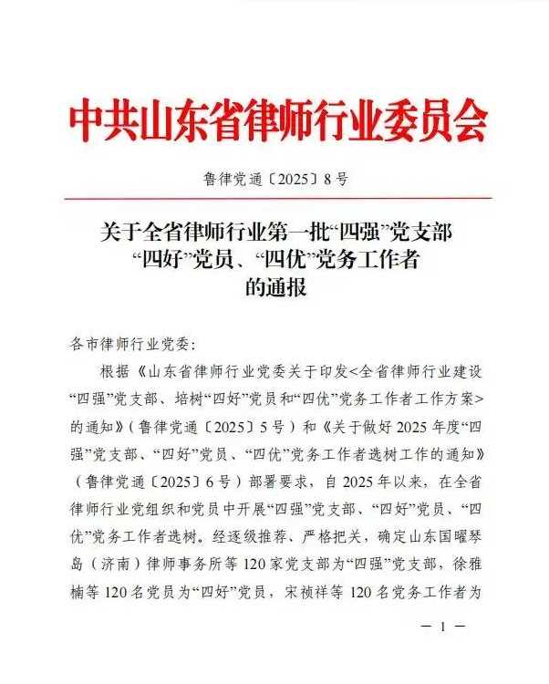 近日,山东省律师行业第一批“四强”党支部、“四优”党务工作者评选结果正式公布,我所商河分所迎来重磅喜讯:商河县律师行业党支部获评“四强”党支部,苏倩倩同志荣获“四优”党务工作者称号。这份省级荣誉,既是对商河分所党建工作的高度认可,更是对全体同仁深耕专业、坚守初心的最好褒奖。